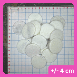 Rond Stenen Schijfje, wit. Diameter ongeveer 4 cm, dikte ongeveer 0,5 cm. Deze ronde schijfjes zijn wit/lichtgeel van kleur, licht transparant en kunnen wat gele/grijze aderen bevatten. Zie fotos voor voorbeeld.
