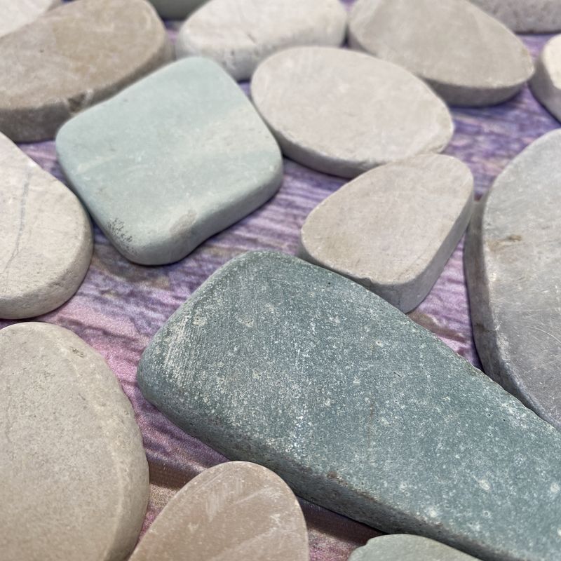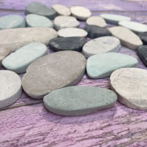 Willekeurige set met 25 gekleurde schijfjes. Het zijn gesneden en getrommelde pebble stenen, ze zijn niet allemaal perfect ovaal of rond van vorm. Gemiddelde lengte 3.5 – 9 cm, ongeveer 0.8 mm dik. Ze zijn glad maar een beetje “stroef”, je kunt er rechtstreeks op werken met stift of verf, zonder gesso.